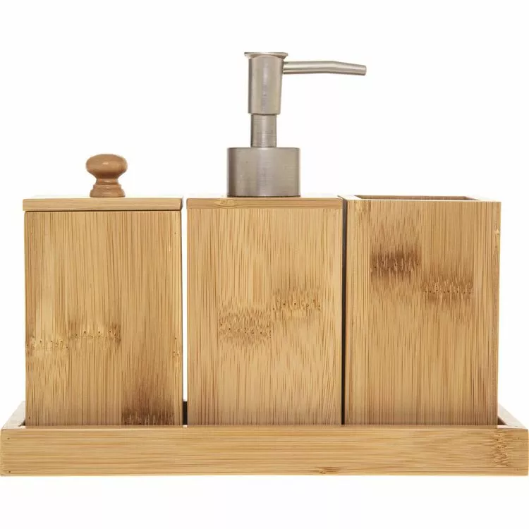 – Coffret contenant un gobelet de salle de bain, un distributeur de savon, un pot à coton et un plateau.