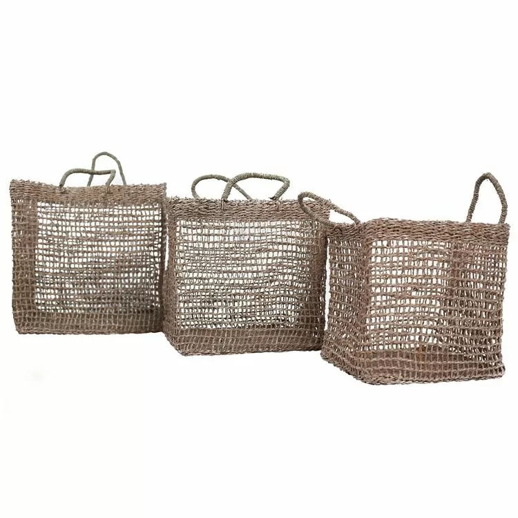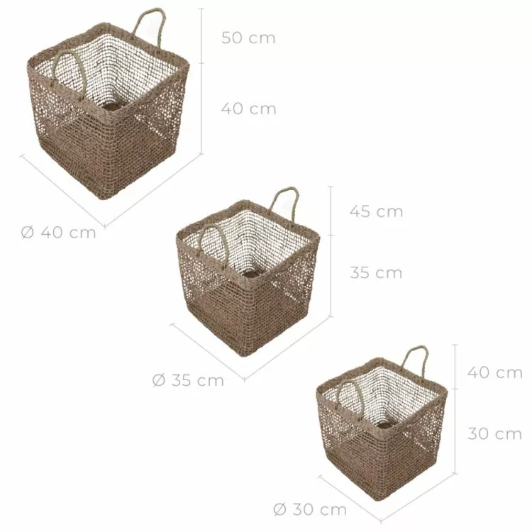 Ce lot de 3 paniers tressés carrés trouvera rapidement sa place dans votre intérieur. Réalisés en fibre naturelle (jonc de mer) les 3 paniers Scar mesurent respectivement 40 x 40 cm, 35 x 35 cm et 30 x 30 cm et se revèlent être de précieux alliés quand il s’agit de marier praticité et style.