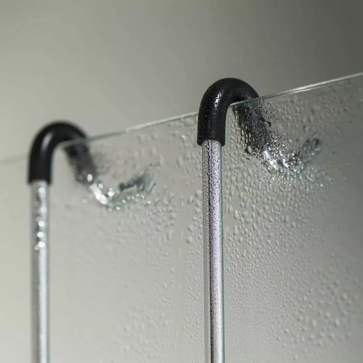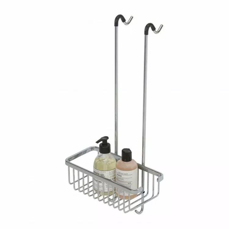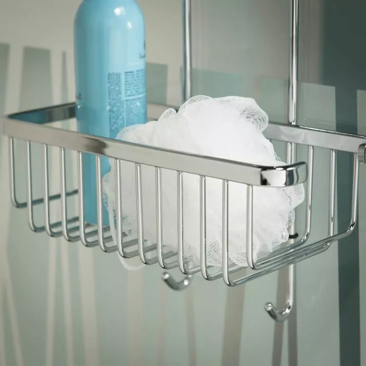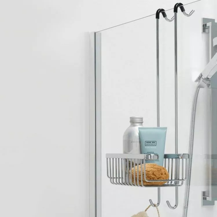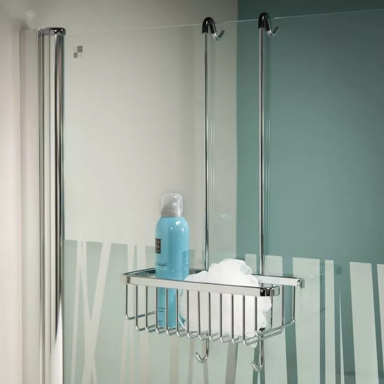L’etagere peut etre suspendue directement de l’ecran de douche ou de l’enceinte et est equipee de 4 crochets.